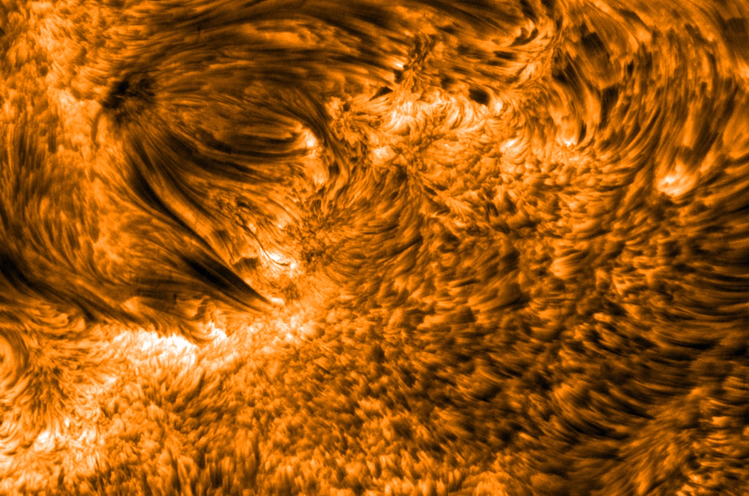 Imagine un tuyau aussi large qu’un État des U.S.A. et aussi long que la moitié de la Terre. Maintenant, imagine que ce tuyau est rempli d’un gaz chaud se déplaçant à 50 000 km/h. Puis imagine que ce tuyau n’est pas fait de métal mais d’un champ magnétique transparent. Tu viens de te représenter un jeune spicule parmi les milliers qui recouvrent le Soleil actif. La photographie ci-contre est peut-être l’image de plus haute résolution jamais prise de ces énigmatiques tubes de flux solaire.