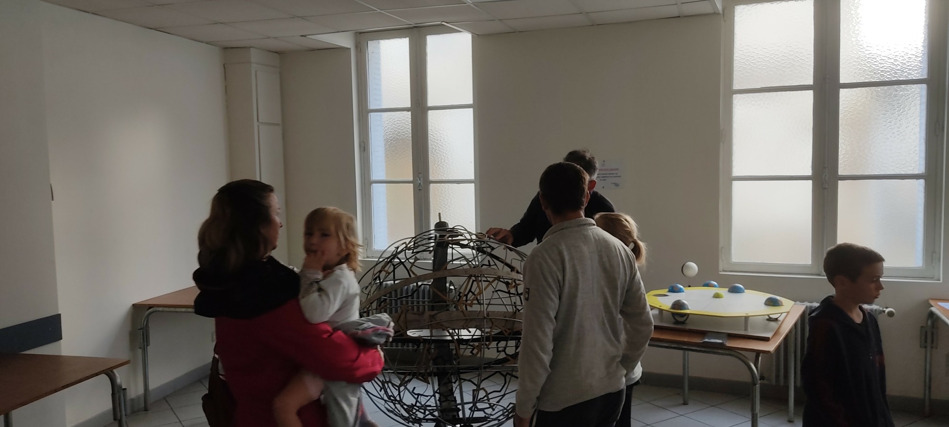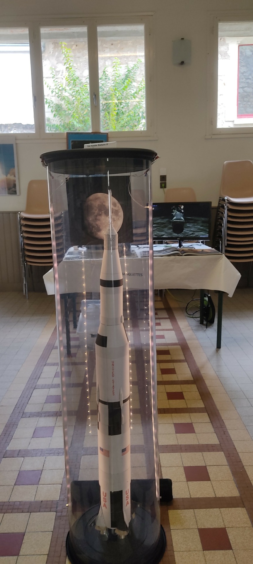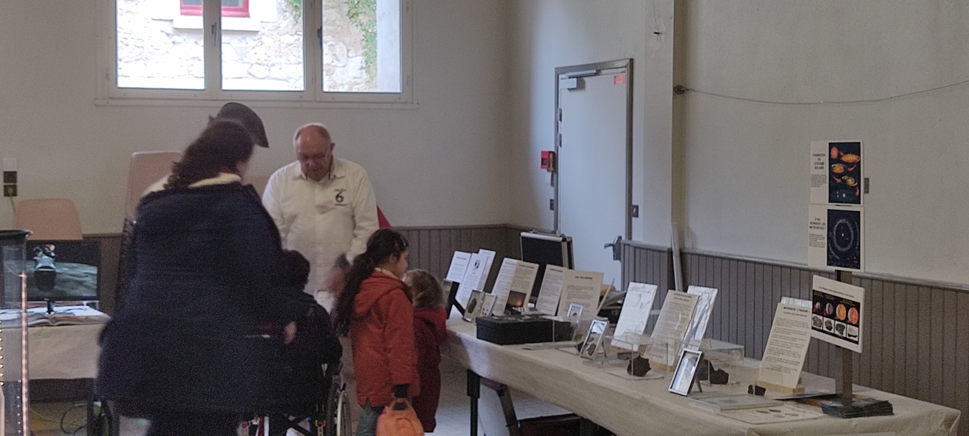 Exposition de météorites par Jean-Michel F, sphère armillaire par Michel D, présentation des panneaux du système solaire par Eric B, ateliers pour les enfants par Xavier L B, maquettes de Saturne 5 et du LEM par Vincent M., présentation vidéo, exposition d’un Dobson.