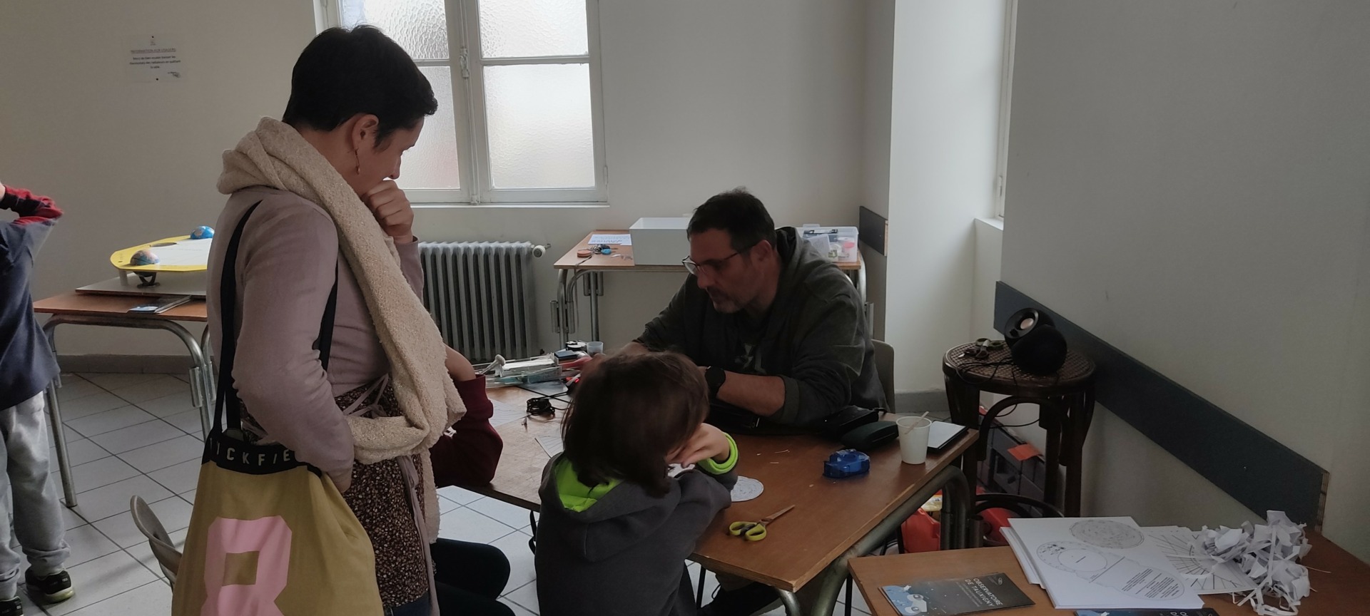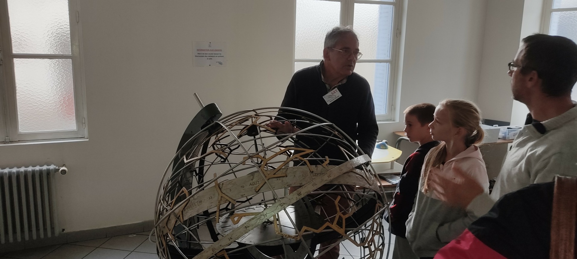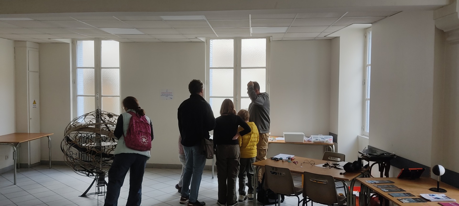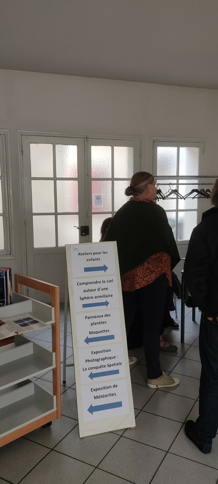 Exposition de météorites par Jean-Michel F, sphère armillaire par Michel D, présentation des panneaux du système solaire par Eric B, ateliers pour les enfants par Xavier L B, maquettes de Saturne 5 et du LEM par Vincent M., présentation vidéo, exposition d’un Dobson.